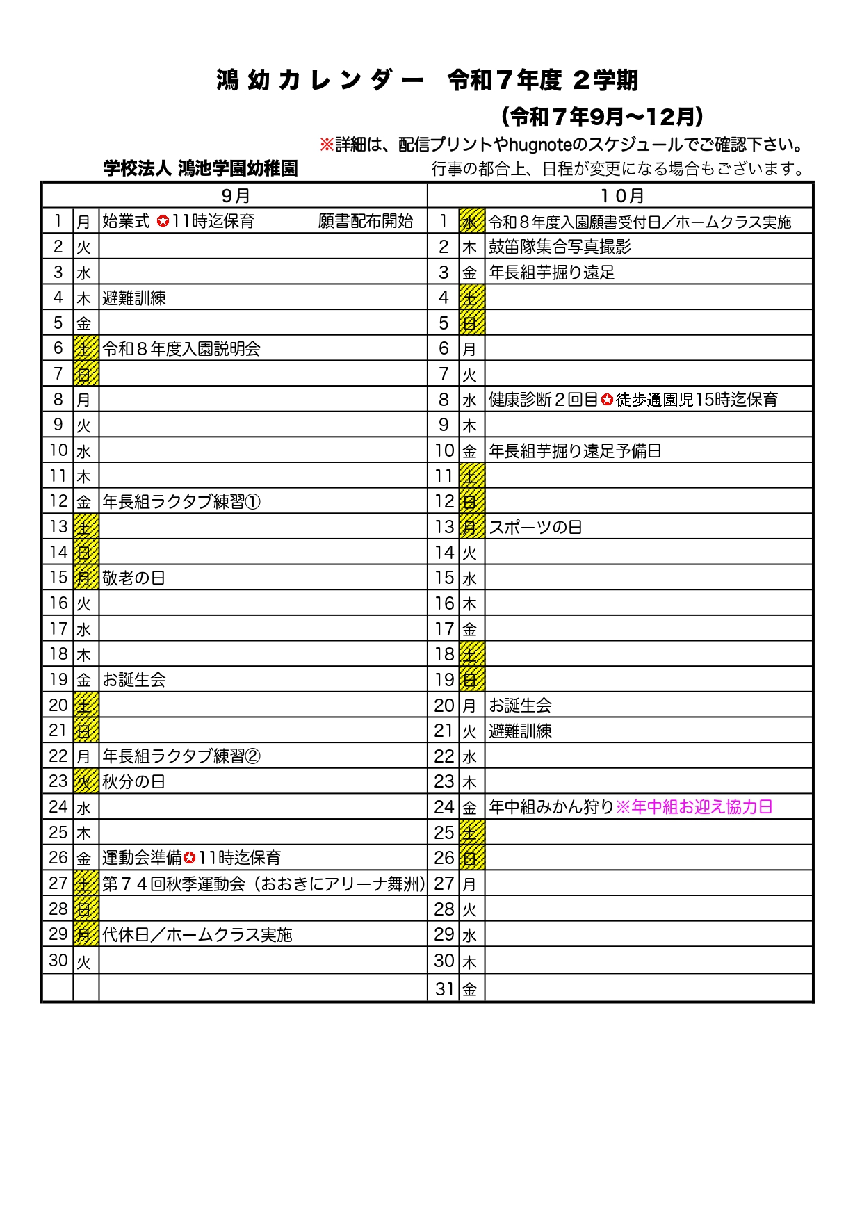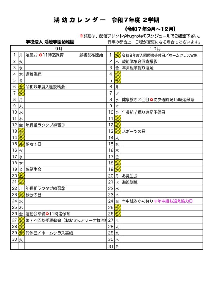 【幼稚園】令和7年度2学期 鴻幼カレンダー