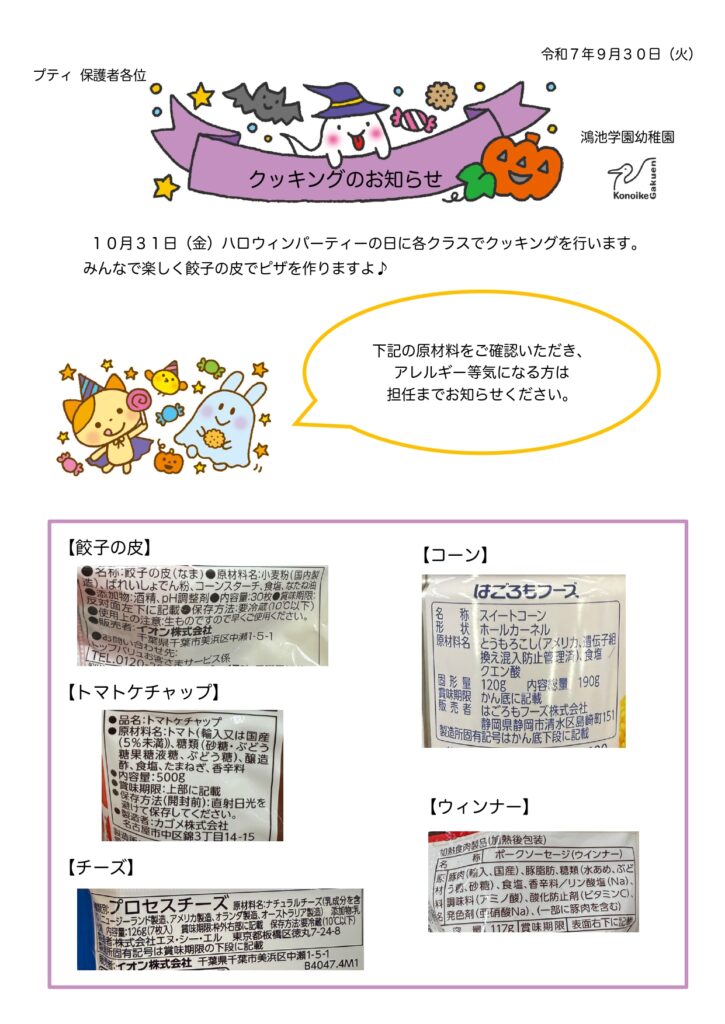 【プティ/うさぎ組】ハロウィンクッキングのお知らせ