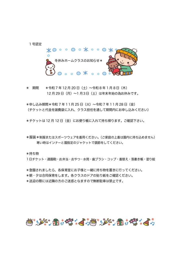 【2号認定】冬休みホームクラスのお知らせ