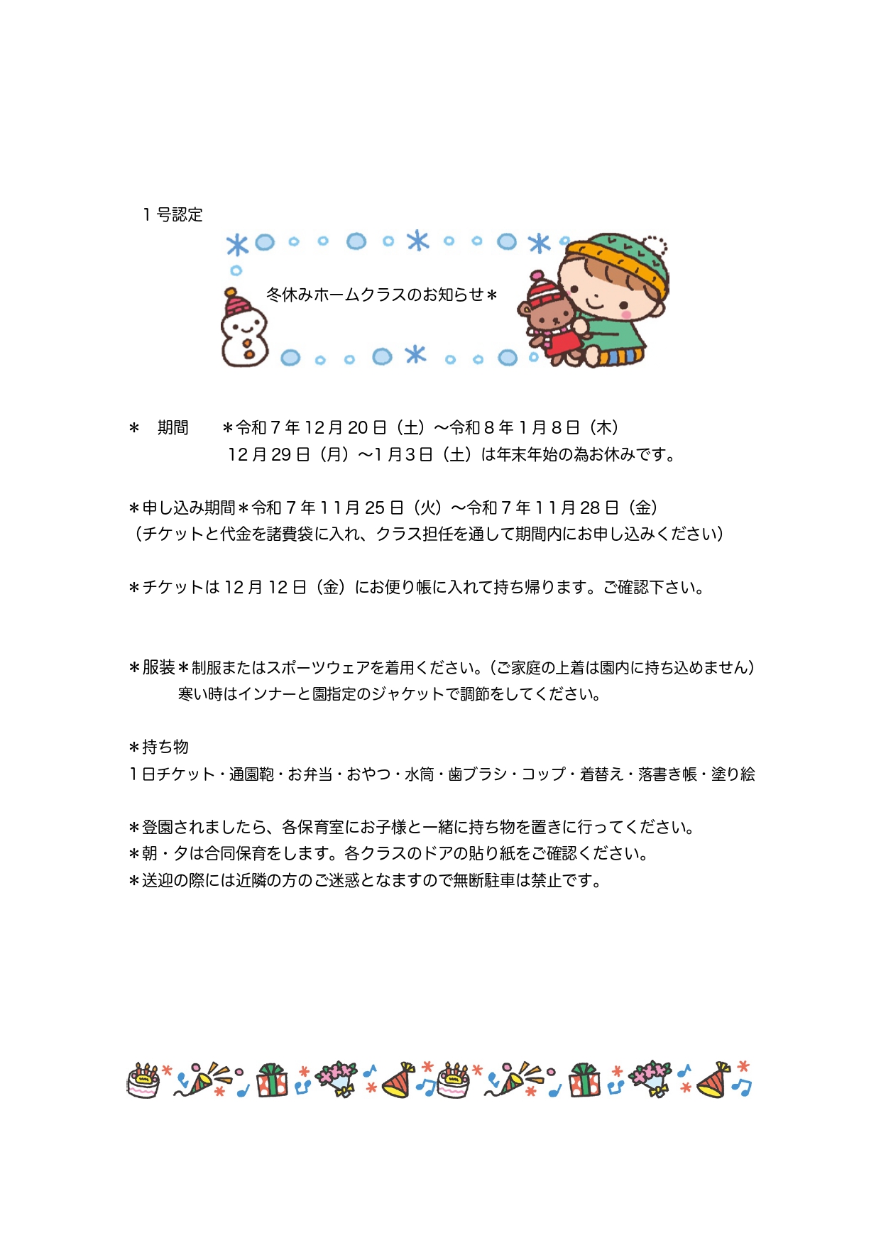 【1号認定】冬休みホームクラスのお知らせ