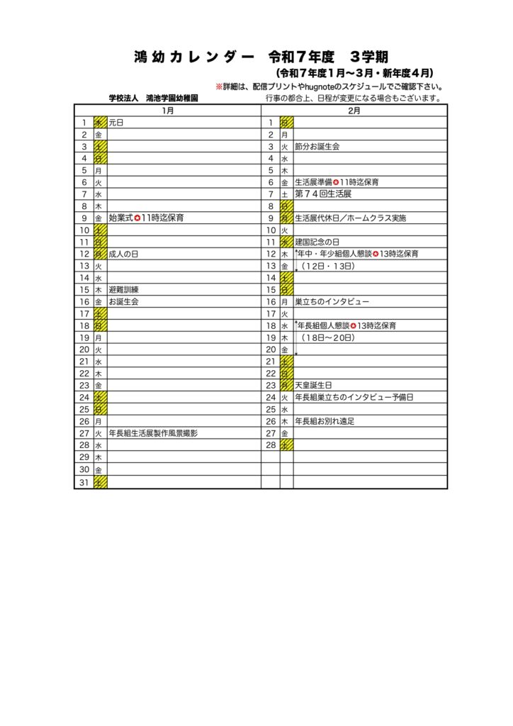 【幼稚園】令和7年度3学期 鴻幼カレンダー