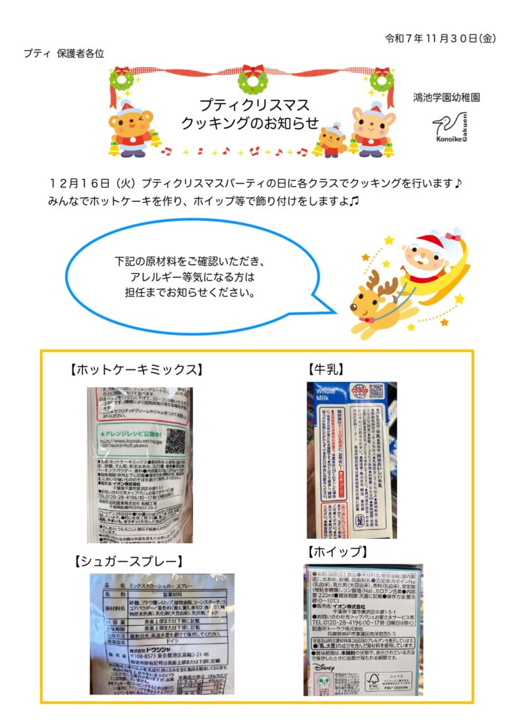 【プティ/うさぎ組】クリスマスクッキングのお知らせ