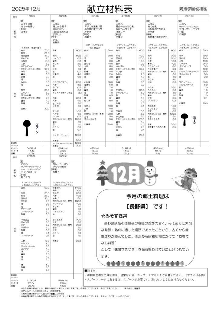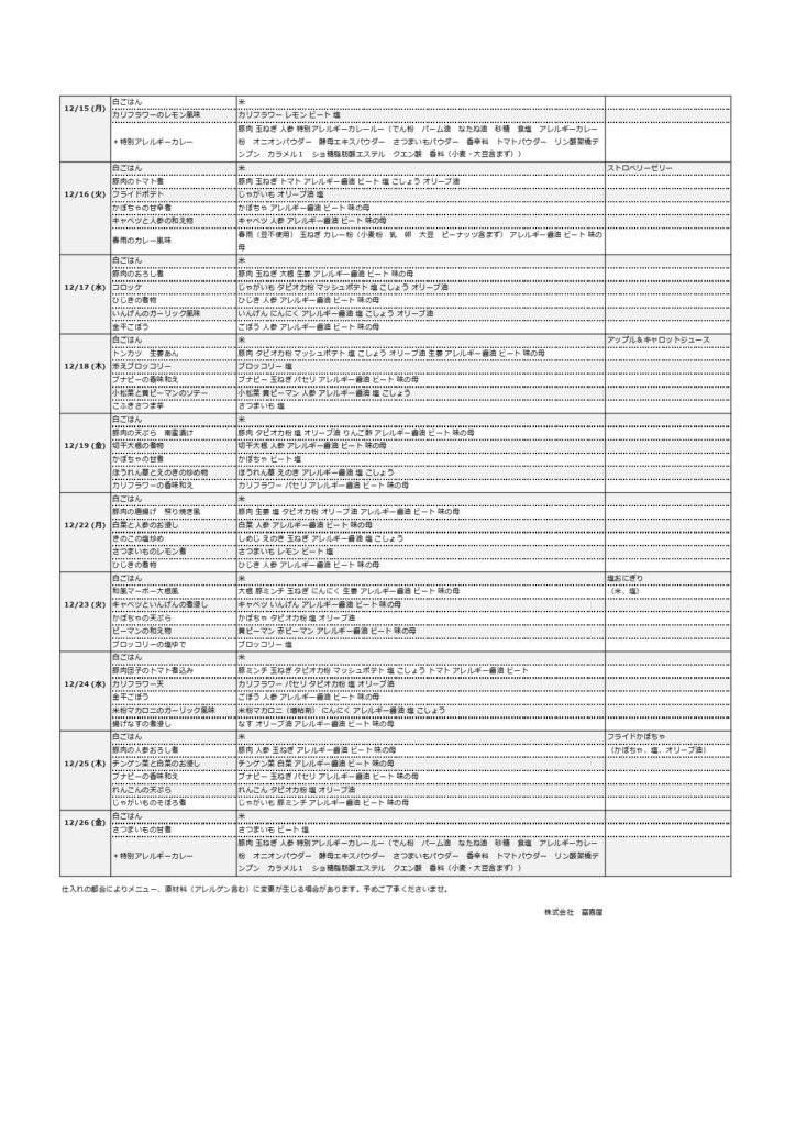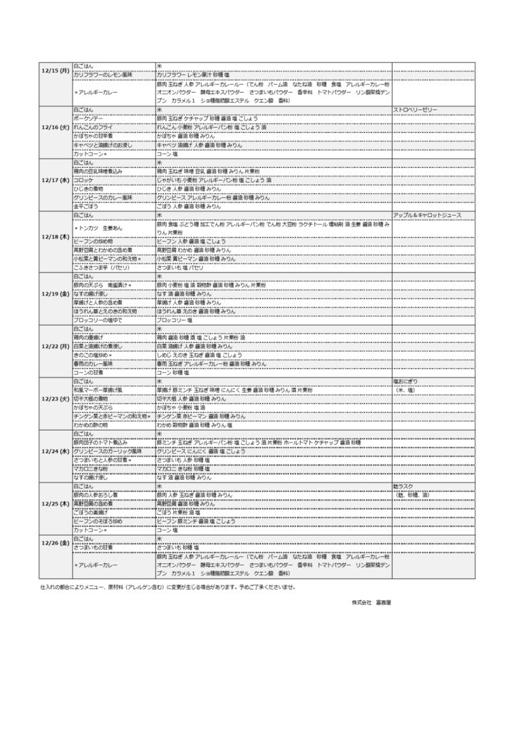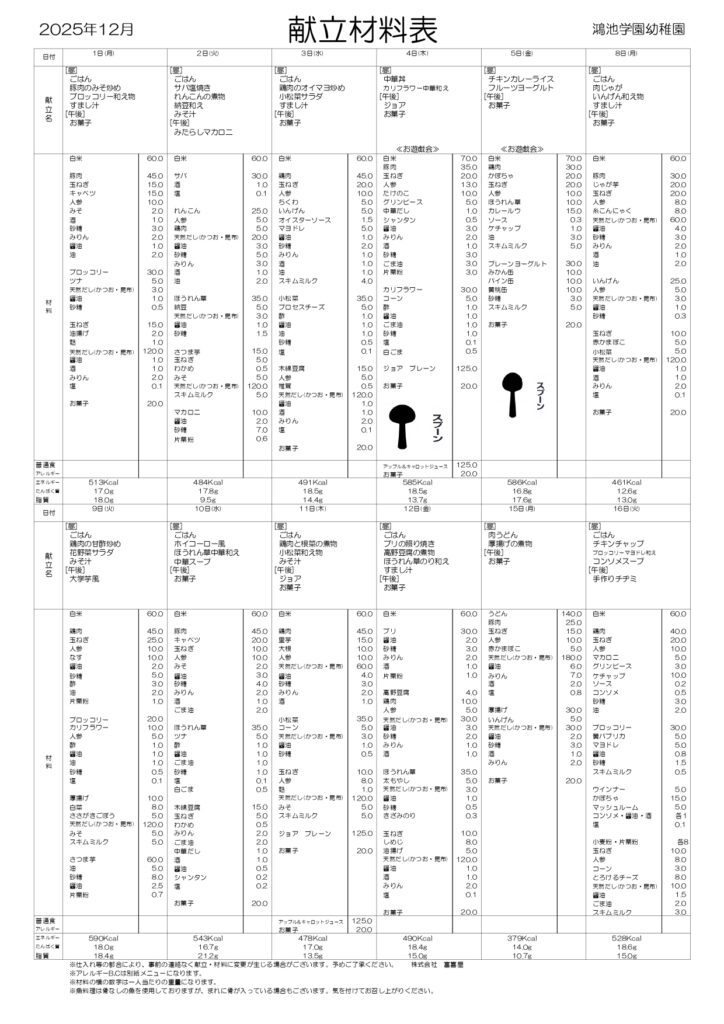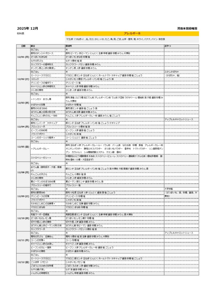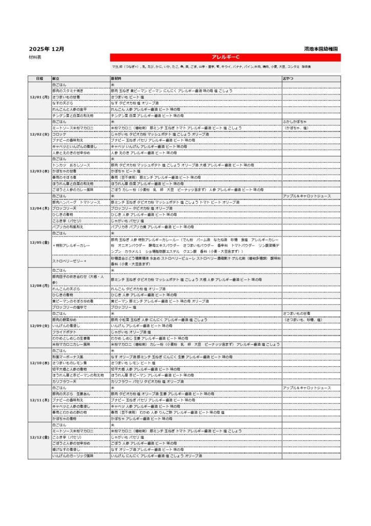 【幼稚園/プティ】令和7年度12月給食献立表(普通食/普通食アレルギー/アレルギーB・C)