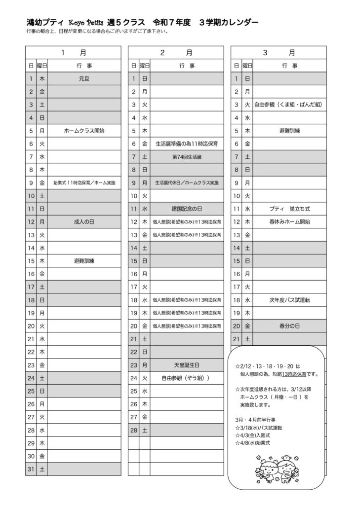 【プティ】3学期カレンダー