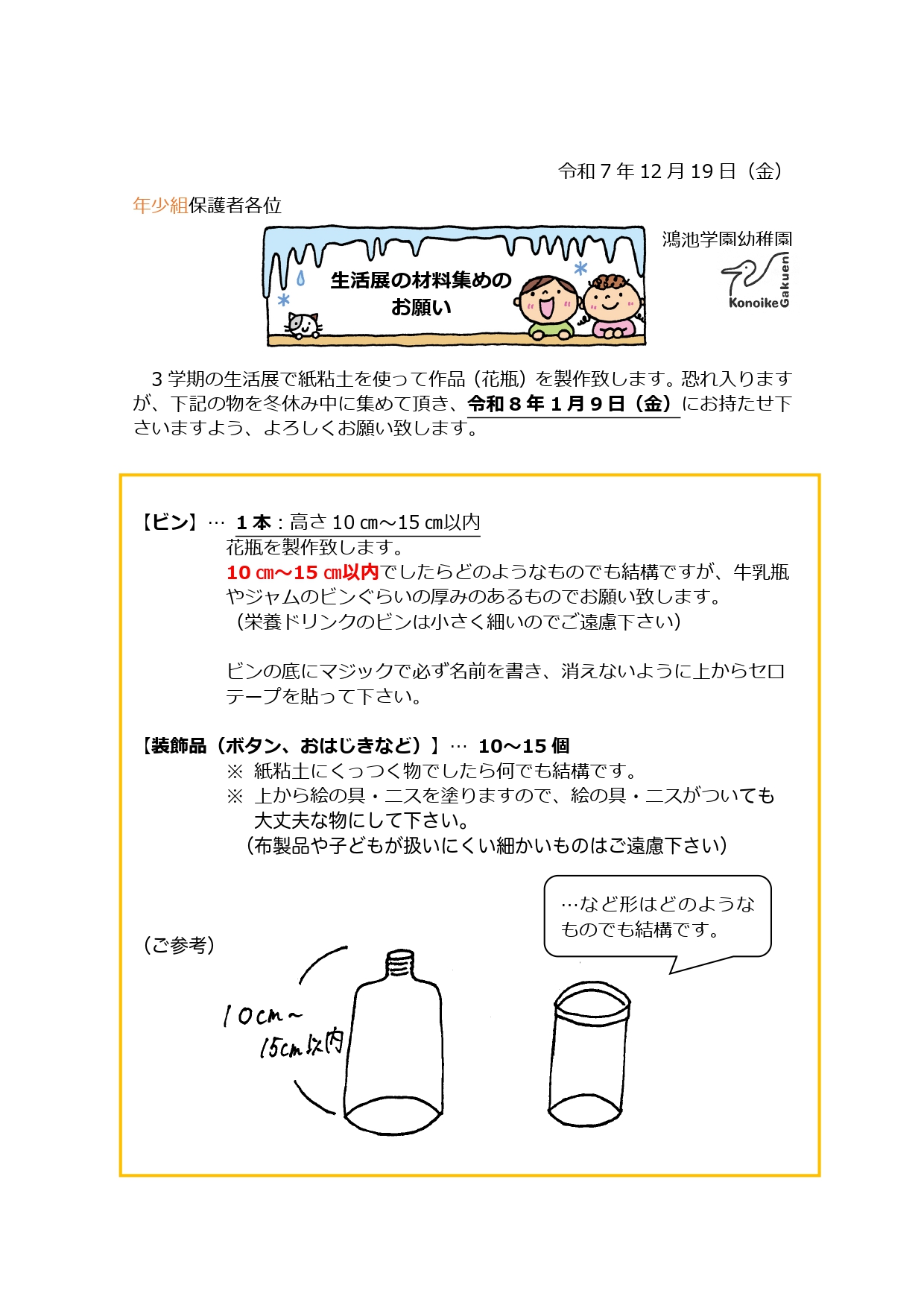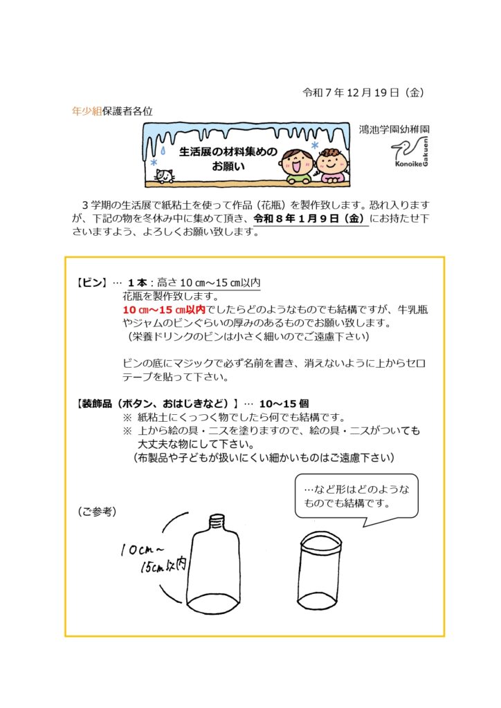【年少組】生活展の材料集めのお願い