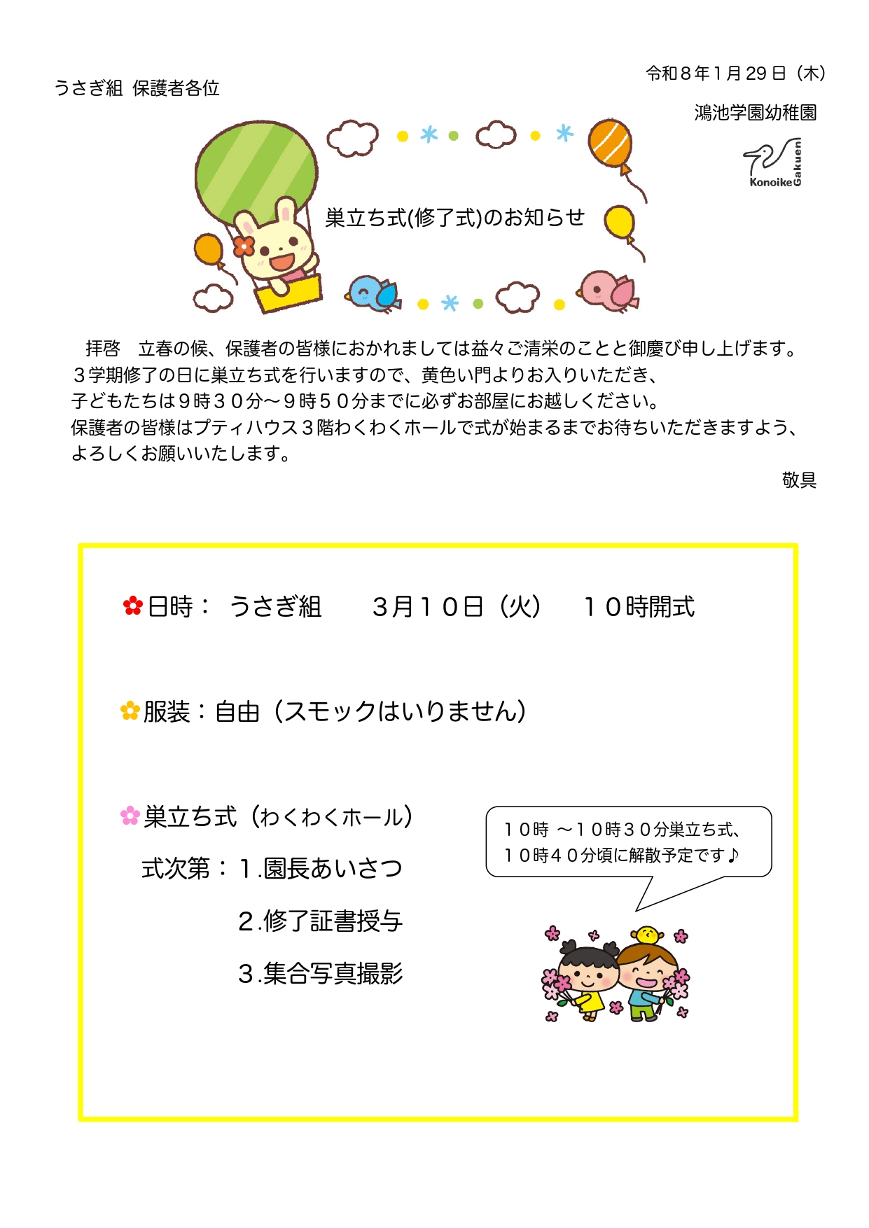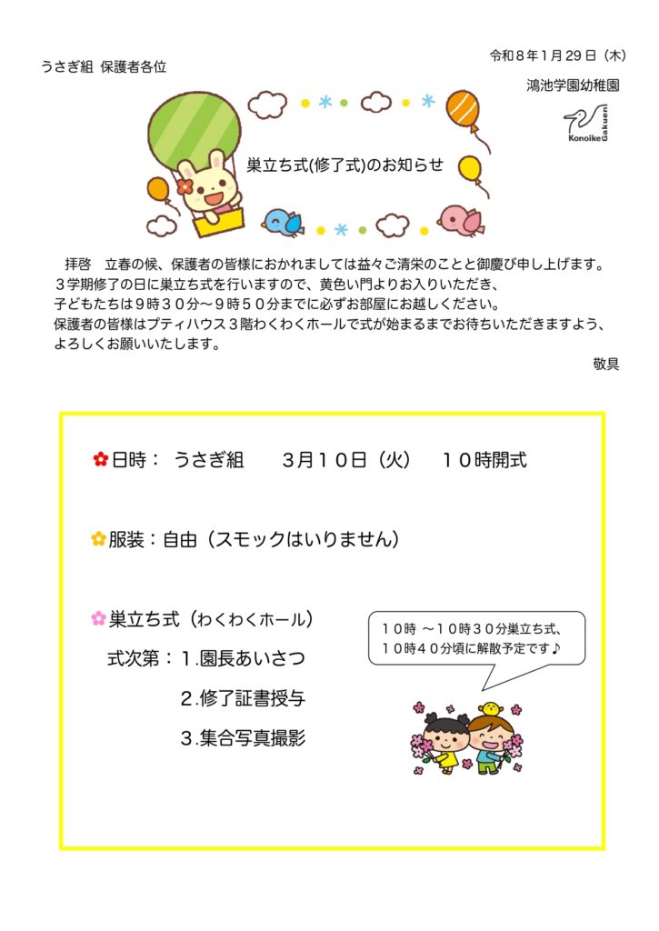 【うさぎ組】巣立ち式のお知らせ