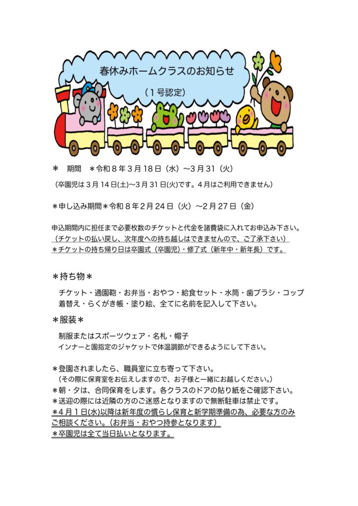 【1号認定】春休みホームクラスのお知らせ