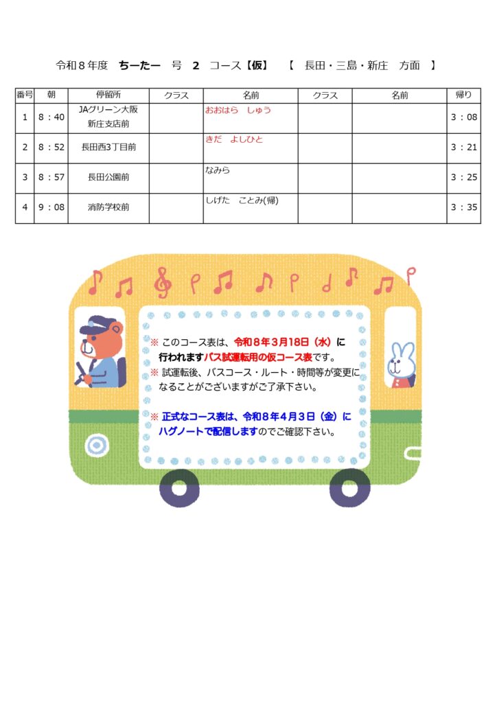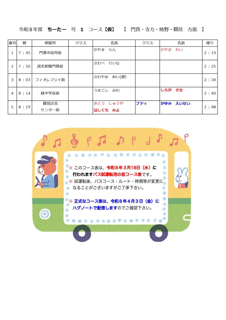 【令和8年度バス通園の方/年中・年少組】バス試運転のお知らせとお願い